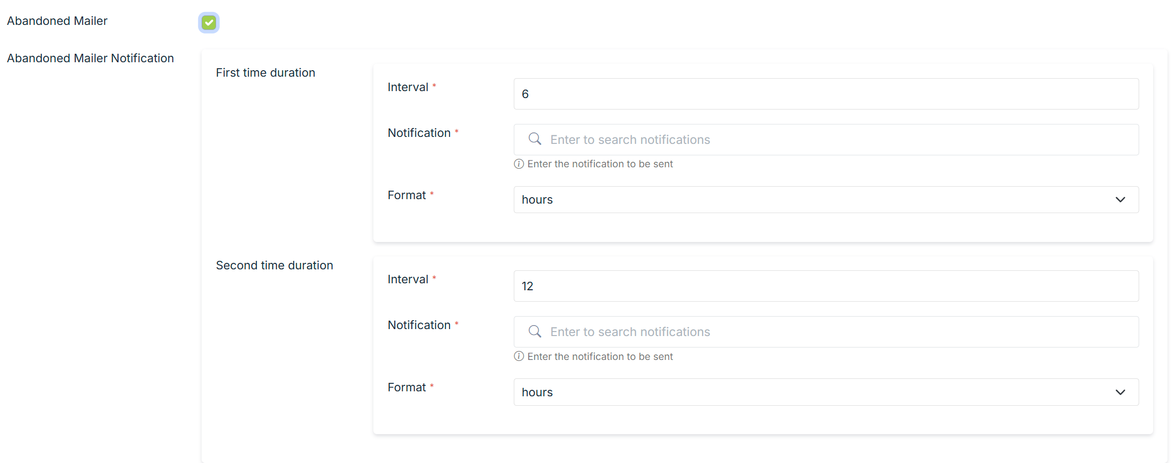 Enabling the Abandoned Mailer functionality lets you set the time intervals for the abandoned mailers. Provide a number in the interval field and format in hours or days.