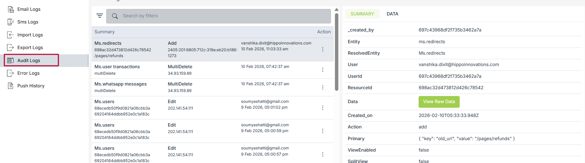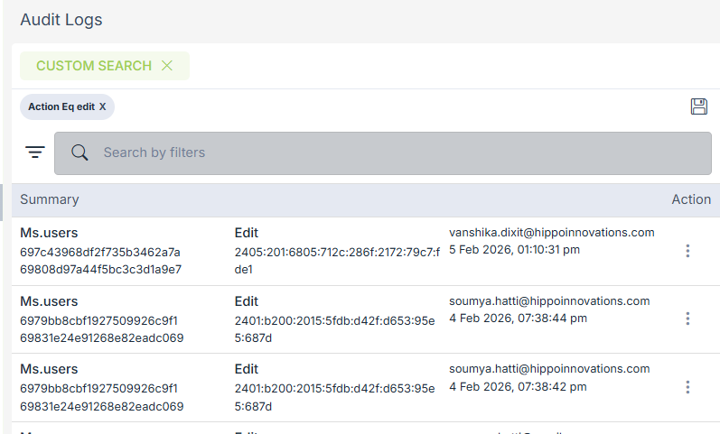 You can view the audit logs in the Logs > Audit Logs section in StoreHippo Admin Panel.