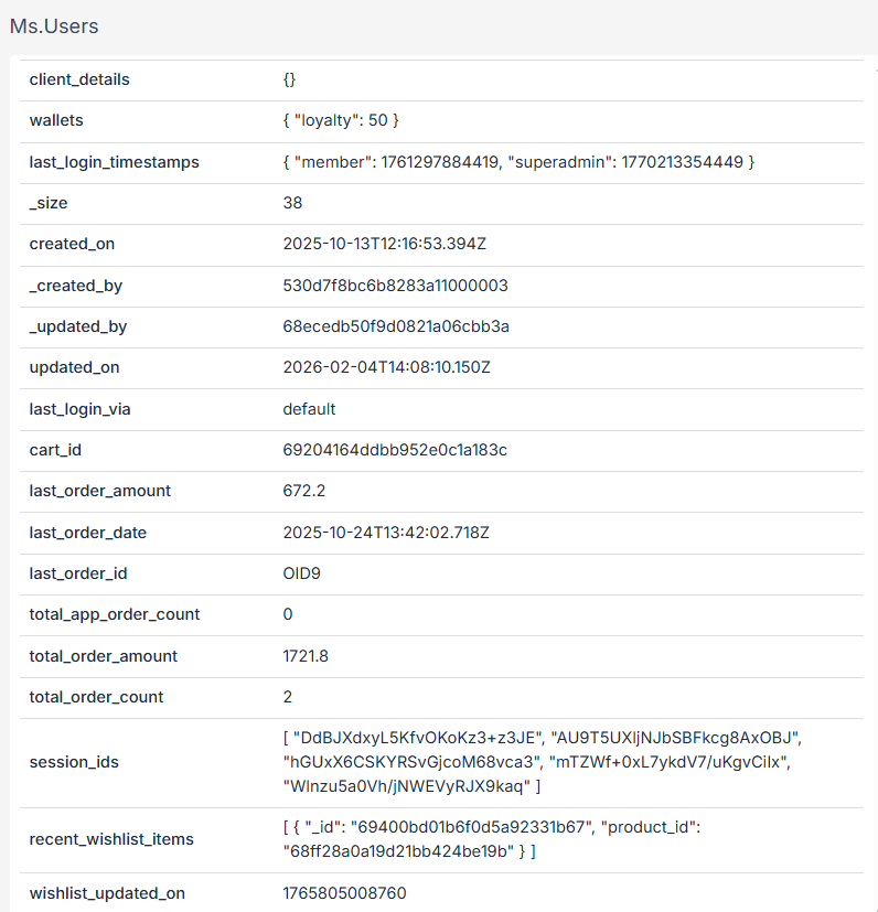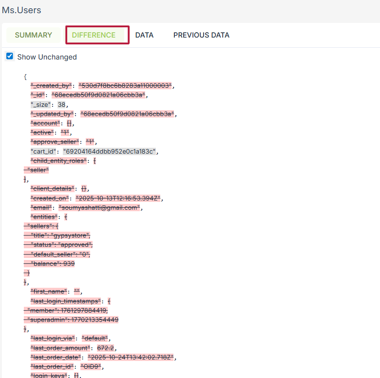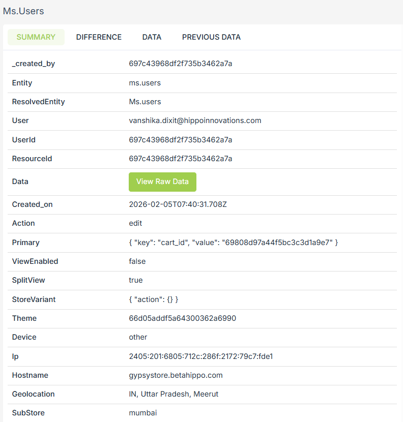- Previous data: The data before the update process. Shows the raw data in JSON format.