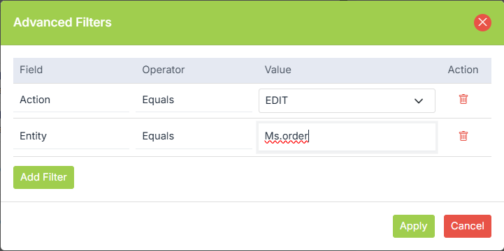 - Action: The action that was performed. The actions can be ADD, EDIT, DELETE etc.