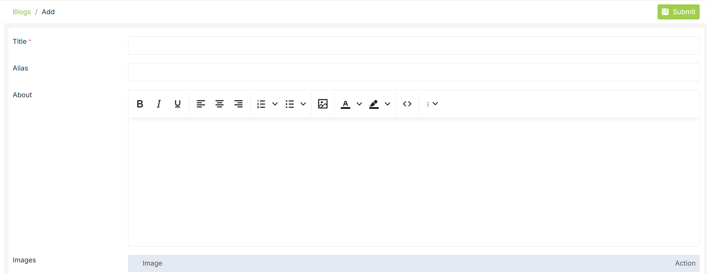 To add a new blog, click on the Add New button in the top right corner. Clicking on the button will open a form with following fields: