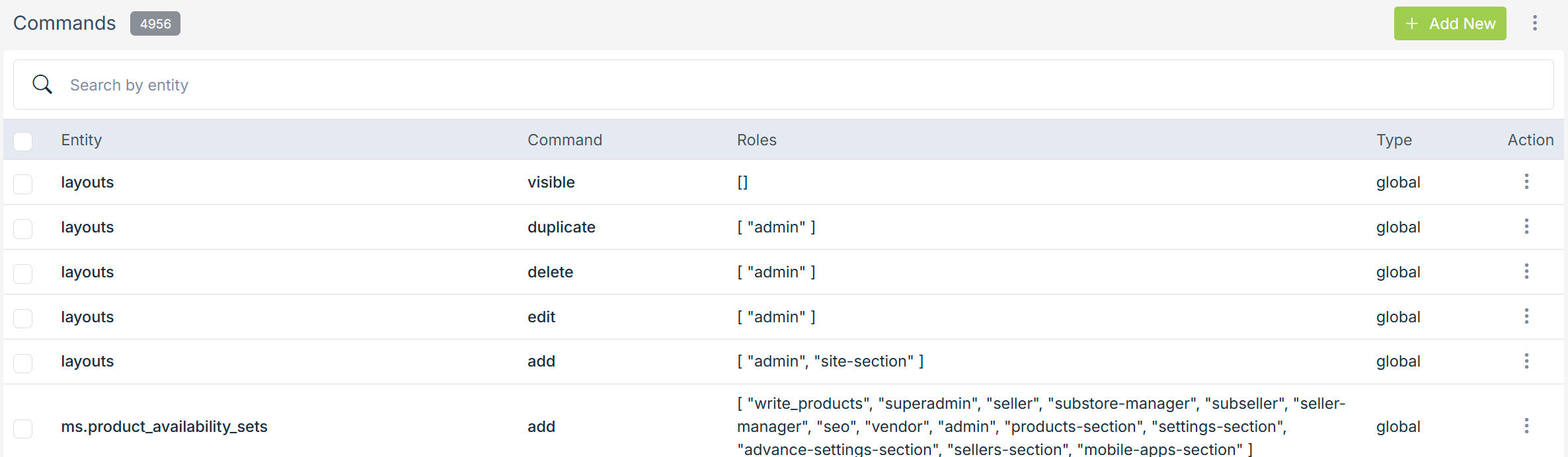 StoreHippo supports two types of roles for users: Group based and Granular. In the case of granular roles, you can specify permissions at the entity command level. A command record for an entity gives permission to execute that command on the entity.