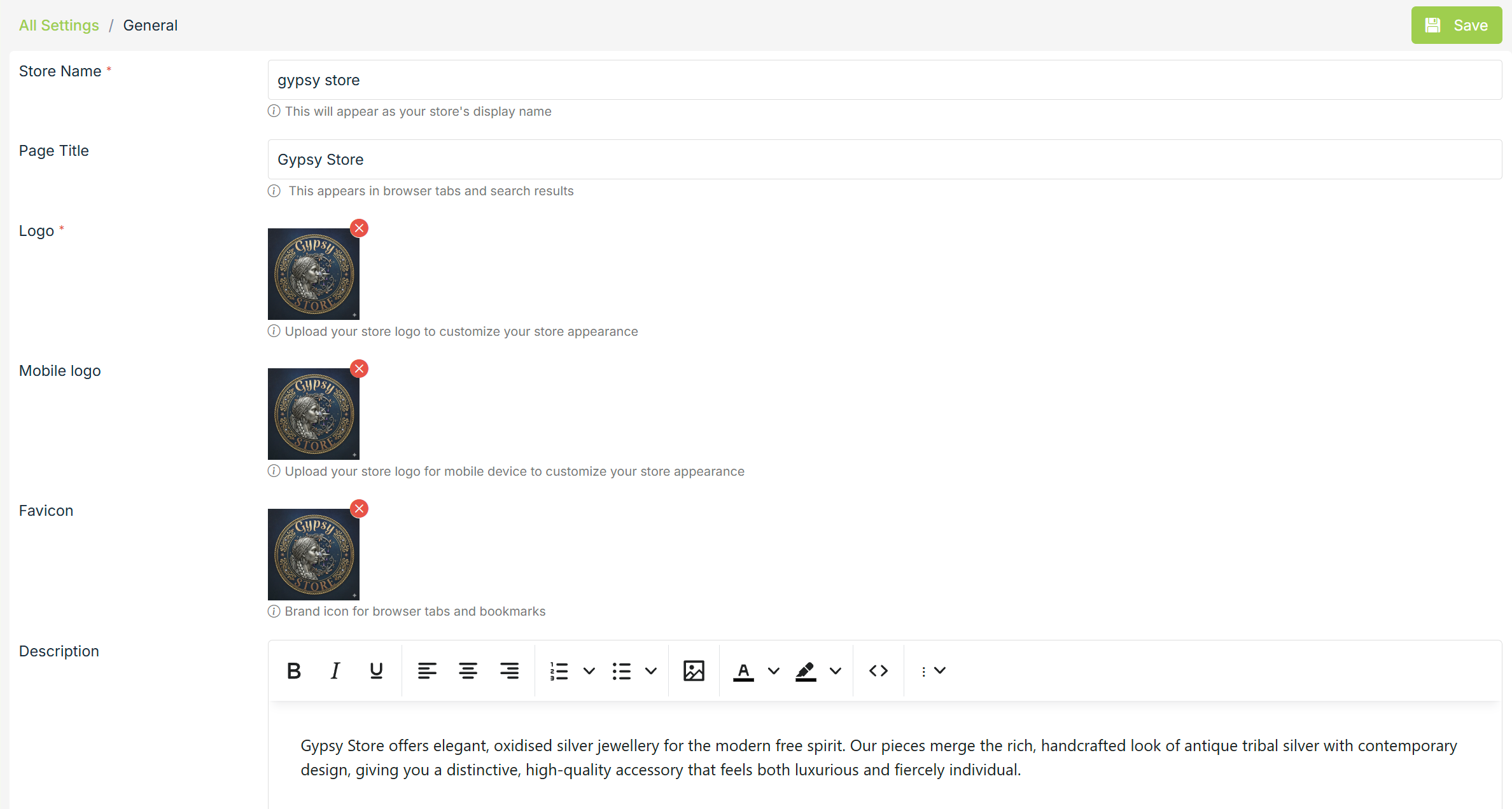 Here you can publish the Logo of your store. The logo is used in the site header on the Storefront as well as in Notifications.