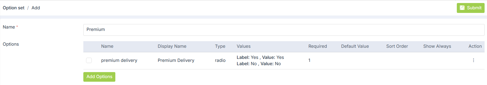 - Provide the Name as 'Premium Delivery' and click on Add Options to add options.
