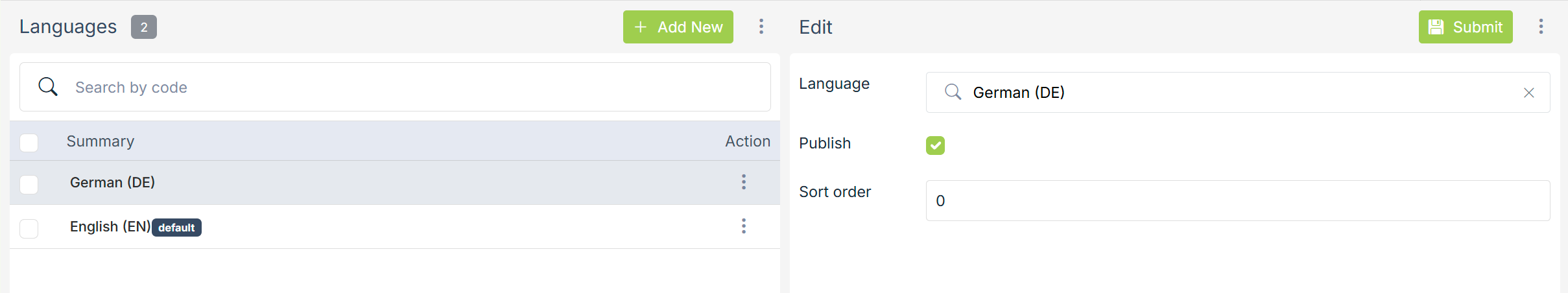 To add a language, click on Add New button. Clicking on the Add new button opens the form with the following fields: