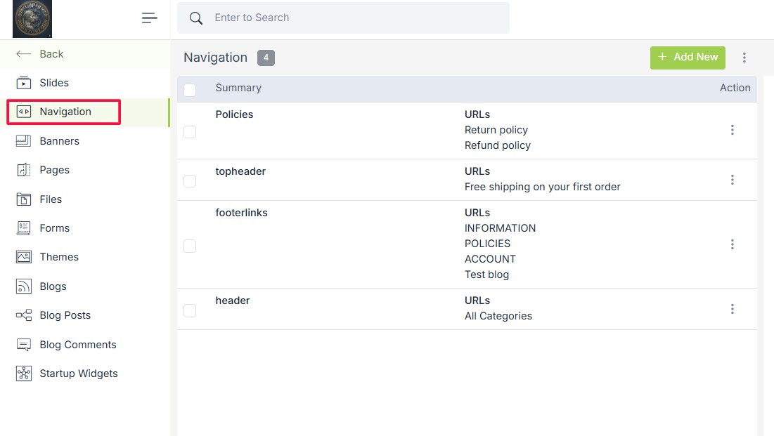 Go to the Site > Navigation section in the StoreHippo Admin Panel to access navigations.