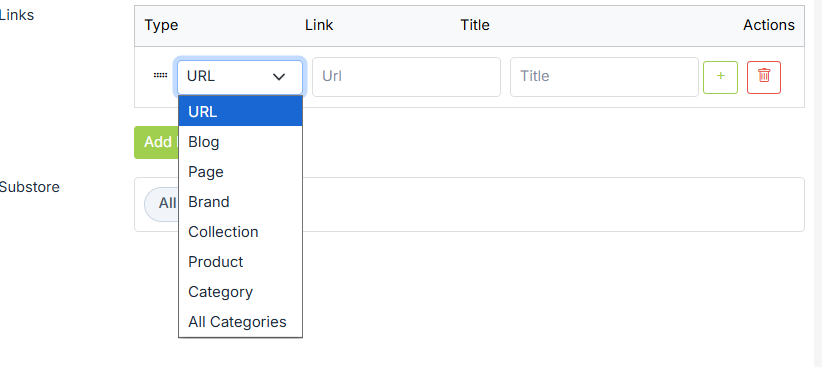 Define the type of link here. You can choose the type from the drop-down whether it's a direct link or applicable to the categories, collections, blogs, etc. Following are the types to choose from: