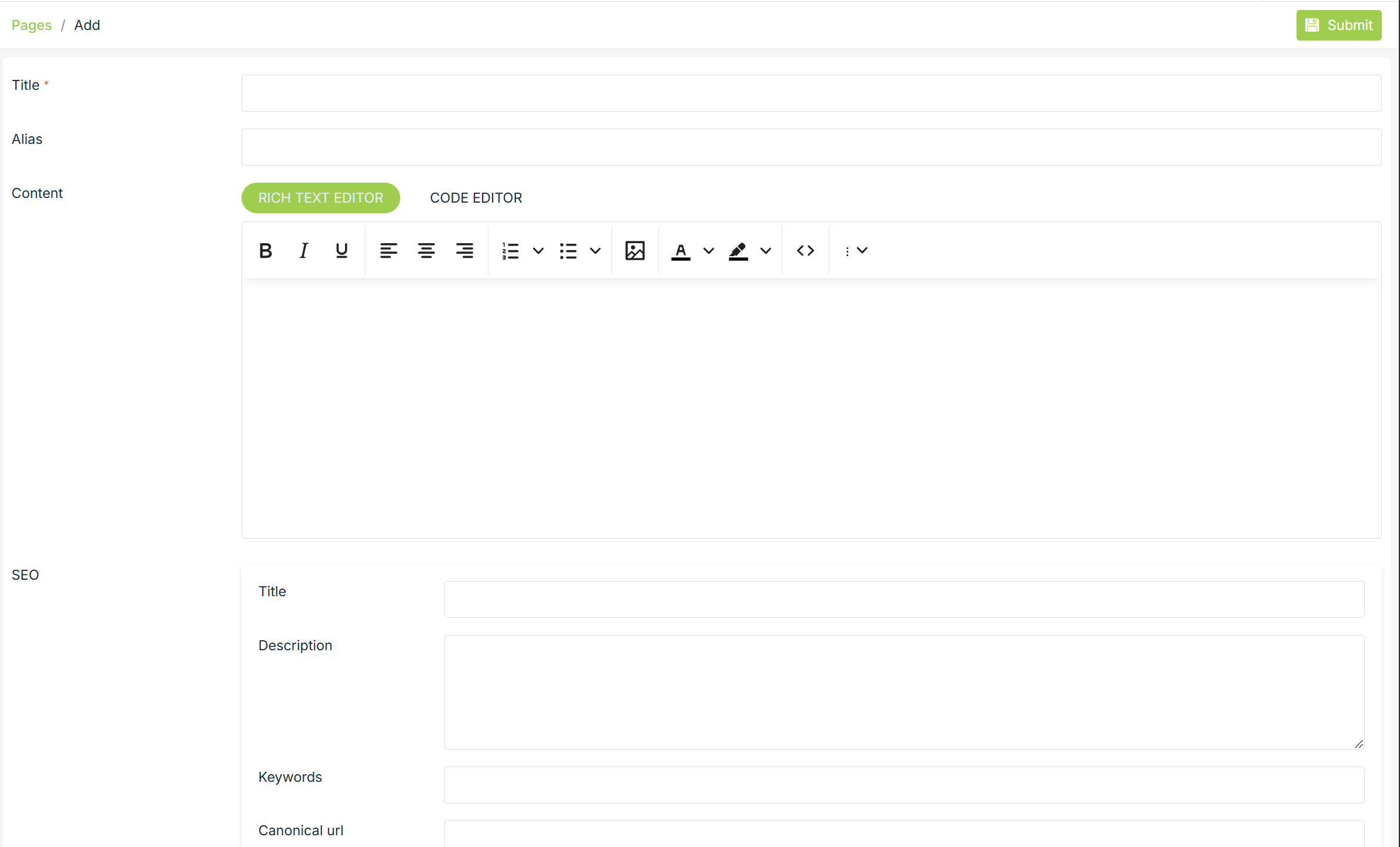Enter the SEO details for the page here. The SEO details include the title of the page, its description, canonical URL, and sitemap priority.