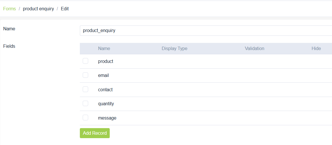 The product enquiry form is one of the built-in forms and is used to control the user queries regarding any product on the storefront. You can find and edit the product enquiry form in Site > Forms section in StoreHippo Admin Panel.