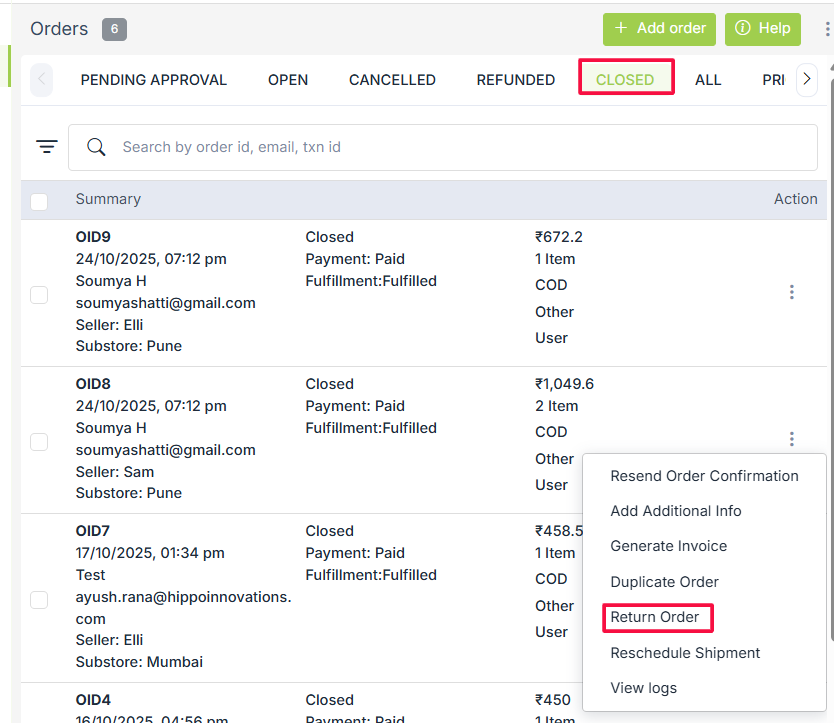 You can add a return request on the customer's behalf from the Orders section in StoreHippo Admin Panel. Only Closed orders can be returned. To return an order, click on the order to be returned. Click on the vertical ellipsis icon and select Return Order from the drop-down as shown below: