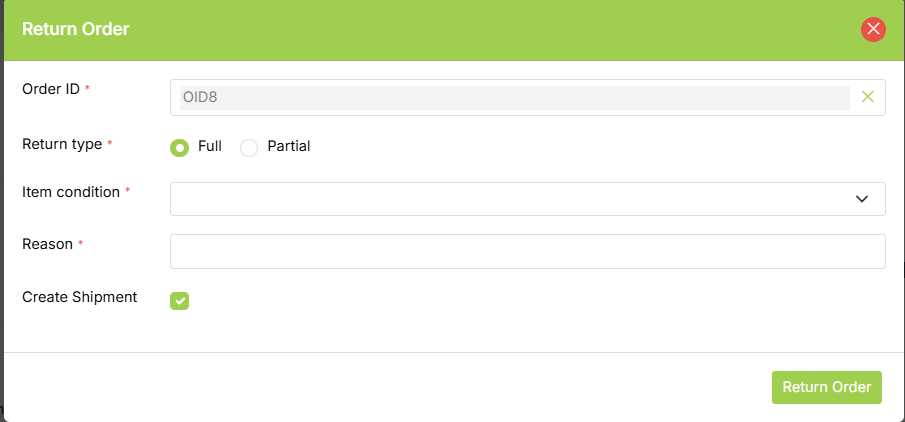 - Full Order: The full order return type means that the order that was shipped to the customer is fully returned.
