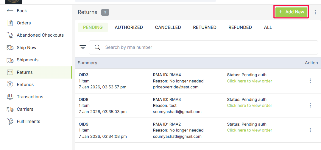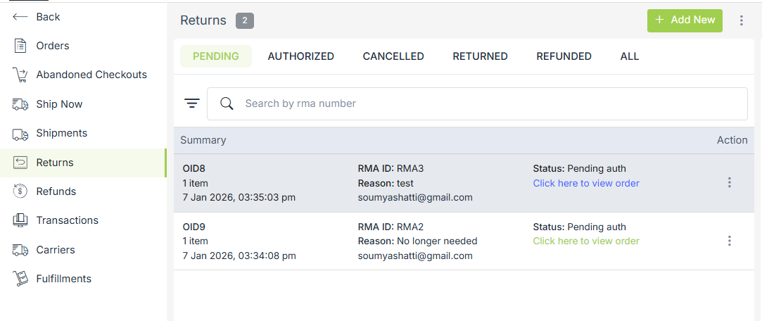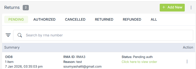 All the returns are managed in the Orders > Returns section of the StoreHippo Admin Panel. You can add a new order return and perform operations like View order, Mark as Received, etc.