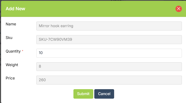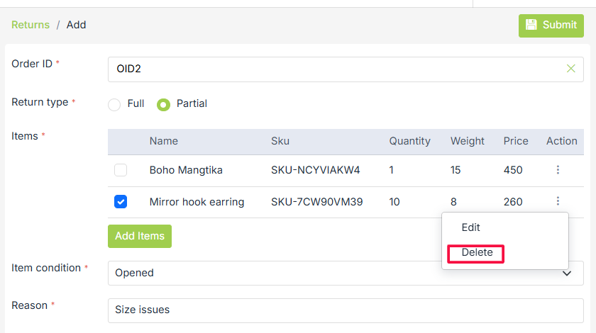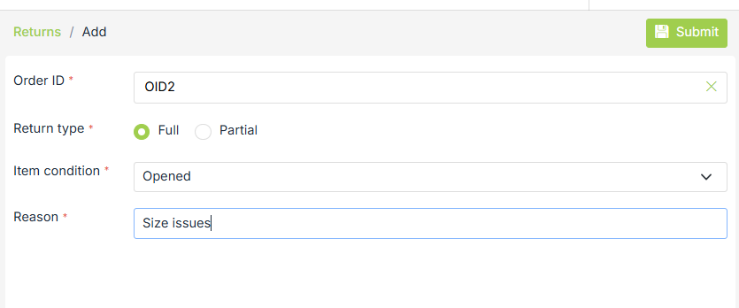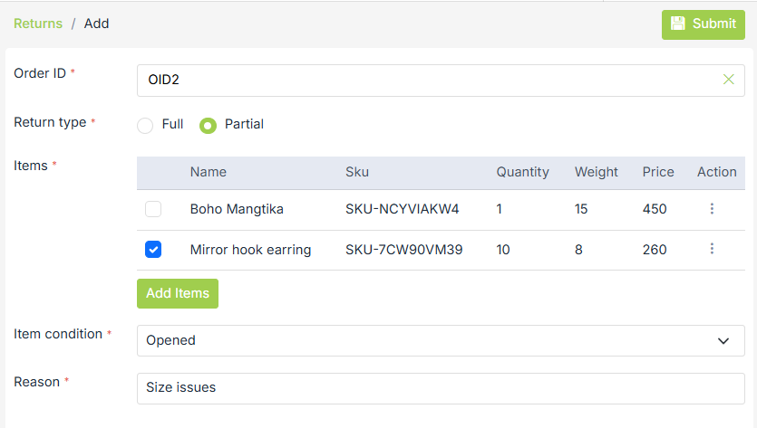 Items are automatically populated in the add form as soon as you select the order ID when full order return type is chosen. Select items to be returned in case of the partial return type.