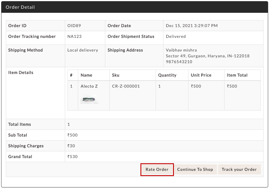 - Click on the View button against the order that you want to rate. The order details page will open up.