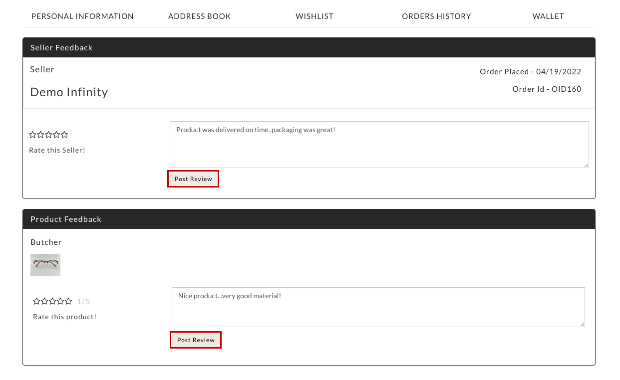 - You can add the product rating as well as the seller rating (or anyone) and enter the review. Click the Post Review button.