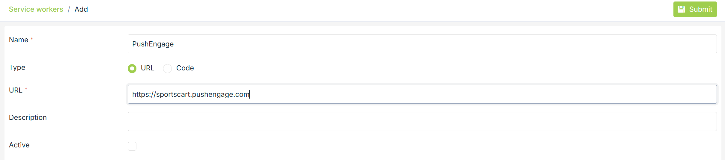 StoreHippo allows you to add external service workers. Some third-party applications, such as Push Notification Apps require you to install their service worker files at the root directory. To achieve that, you can specify the service worker URLs which are imported by the default StoreHippo Servicer Worker.