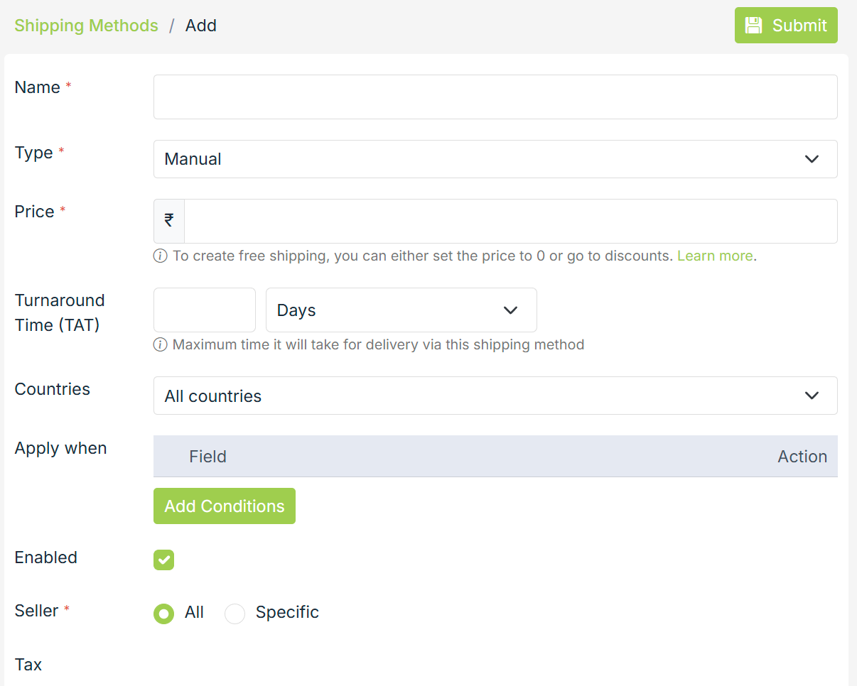 By default, a shipping method is applicable for all the sellers but in the case of Multi-Seller Marketplace, you can define shipping methods for specific sellers as well.