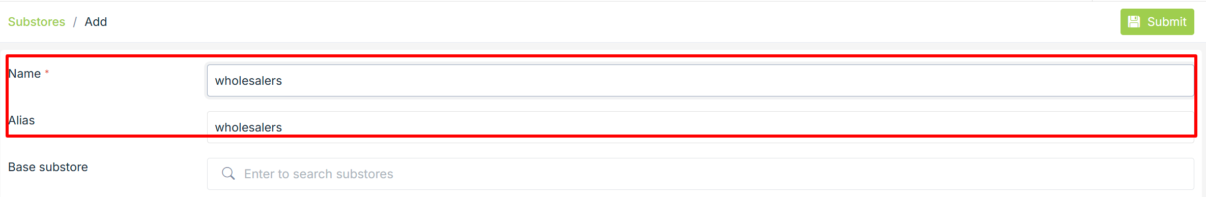 - In the Name field, provide "Wholesales" as the name of the substore.