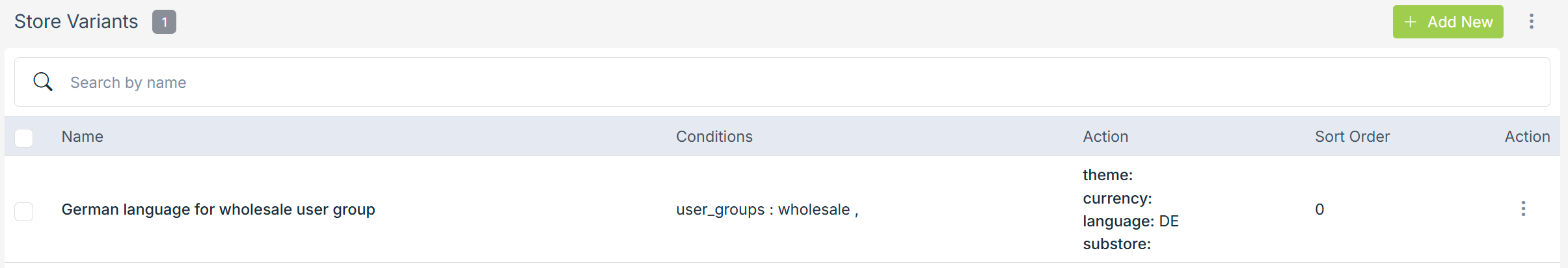 - Click the Add New button to add store variant conditions. The form appears with multiple fields.