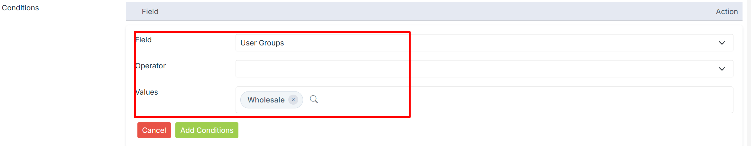 - In the Field, select the "User Groups" option and "One of these" in the Operator field.