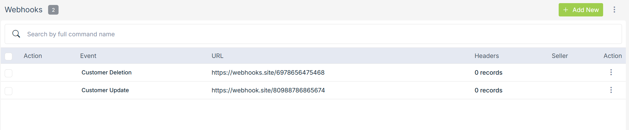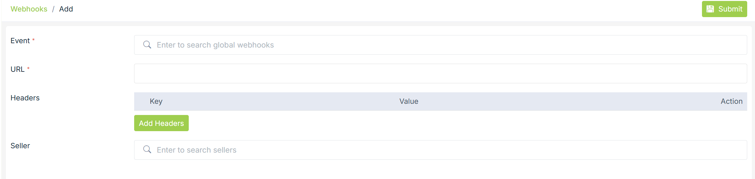 Click on the Add New button to create webhooks. Clicking on the Add new will open the following form:
